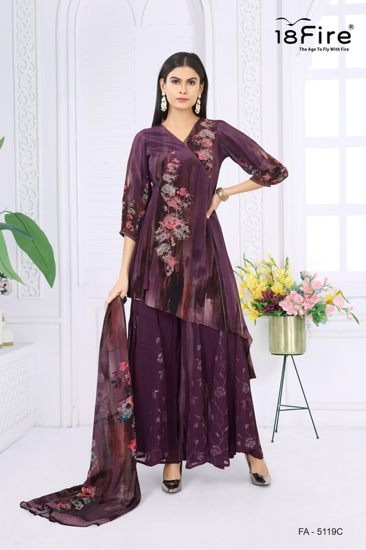 Elegant Wine Indo-Western Asymmetric Plazo Suit with Floral Print & Dupatta (FA5119C)