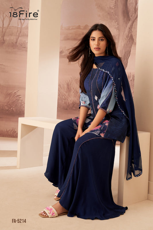 Deep Blue with multi-color floral and abstract print accents asymmetrical top with a V-neck, paired with wide-leg palazzo pants and dupatta (FA5275)