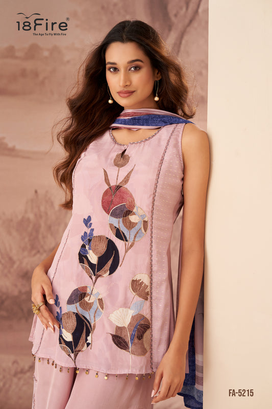 This fuchsia pink set blooms with vibrant floral embroidery, a sleek high neckline, and playful palazzos with gathered texture (FA5246)