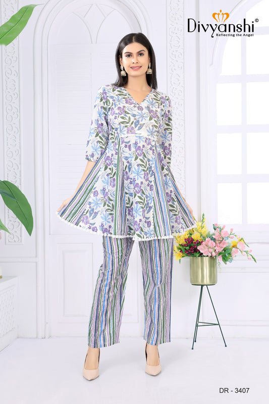 Florence theme V neck printed Kurti with matching bottom (DR3408A)