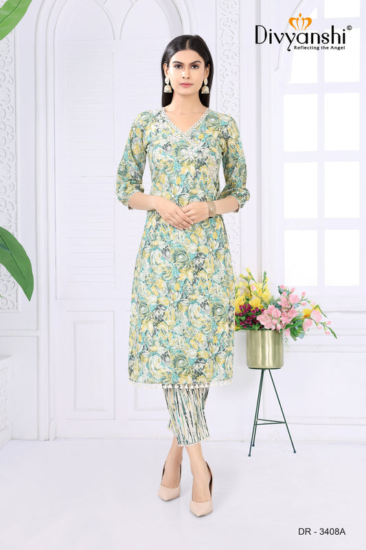 Florence theme V neck printed Kurti with matching bottom (DR3408A)