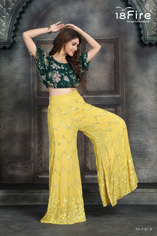 Floral Print Crop Top with Detailed Sequins Work Set," paired with wide-leg yellow bottom (FA3161B)