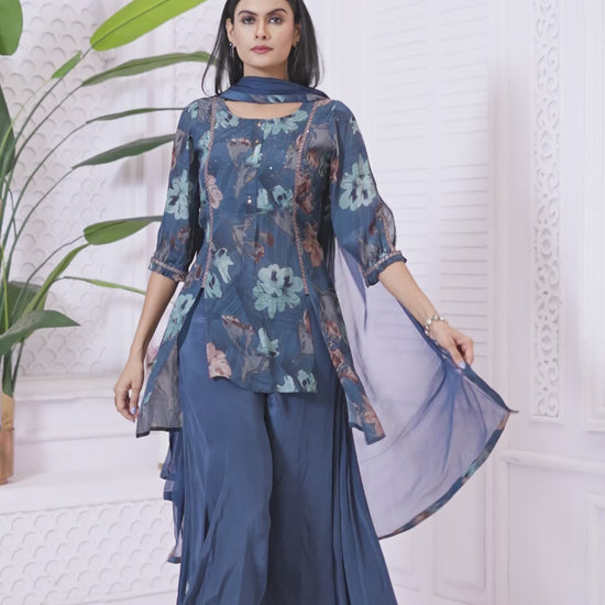 Elevate your ethnic wear collection with the stunning Peacock Blue Floral Print Palazzo Suit. This elegant three-piece ensemble features a beautifully printed short kurti with intricate floral patterns in vibrant hues, paired with comfortable, flowing palazzo pants in a matching peacock blue. A delicate, sheer dupatta completes the look, adding a touch of grace and sophistication. Perfect for festive occasions, casual outings, or special events, this designer Indo-Western outfit offers both style and comfort embrace timeless elegance.