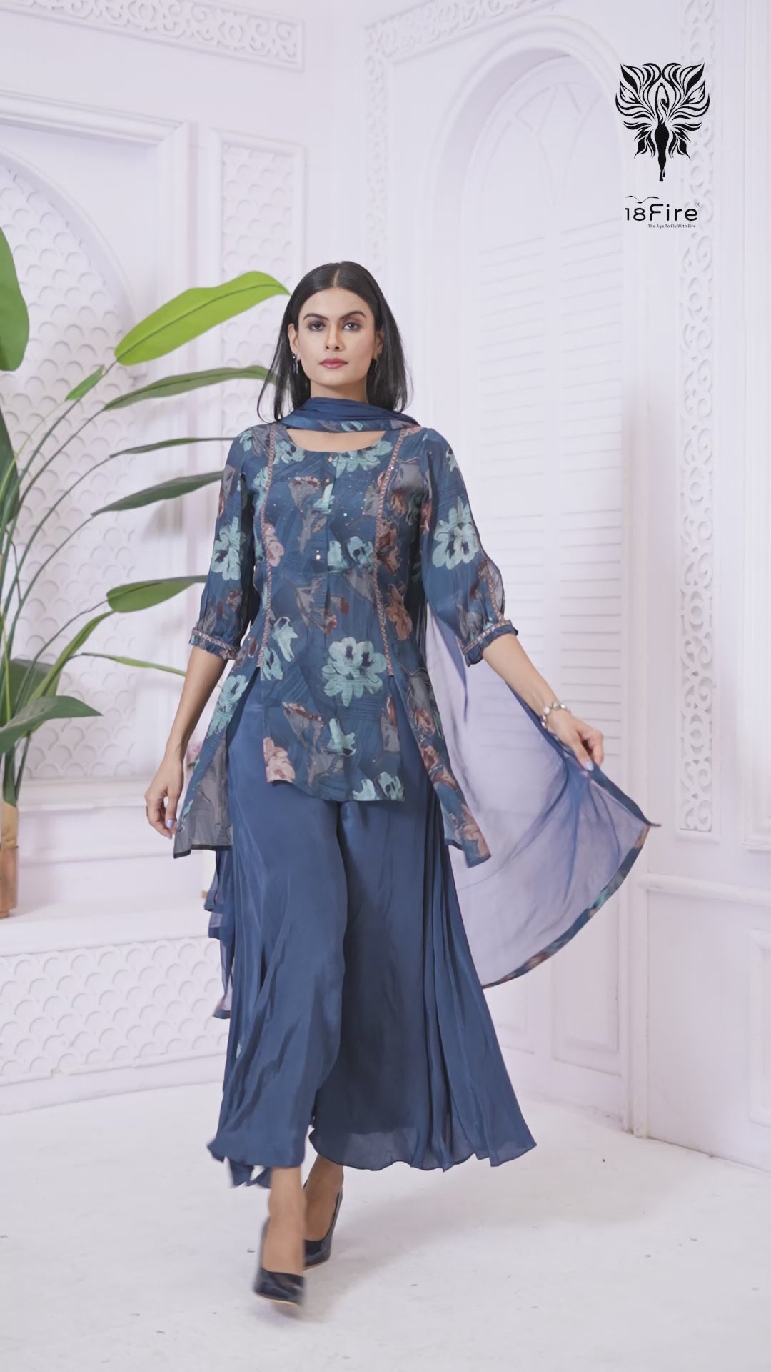 Peacock Blue Floral Print Palazzo Suit (FA5168)